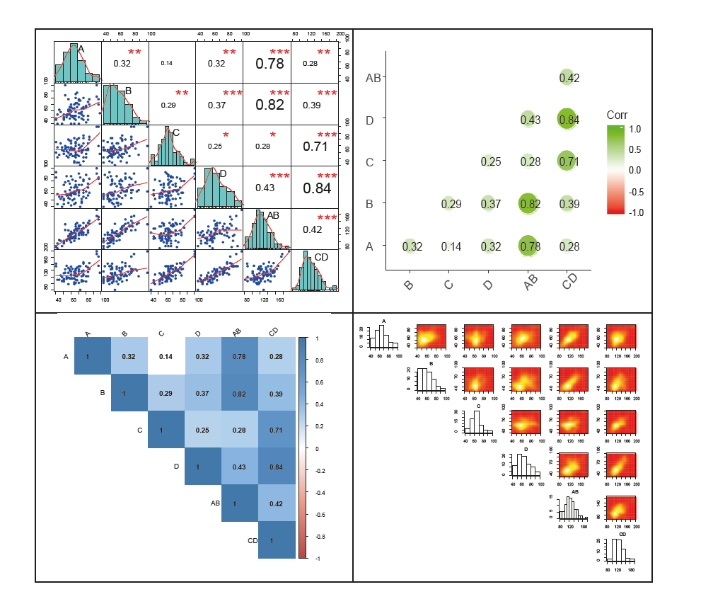 La figura 3 muestra la correlación de Spearman, que fue utilizada en la investigación porque las variables no presentan distribución normal. Los cuadrantes del hemisferio izquierdo A y B están correlacionados moderadamente, mientras que los dos cuadrantes del hemisferio derecho C y D también están moderadamente correlacionados. La correlación más habitual entre el hemisferio izquierdo y derecho del cerebro es de 0.42, este hallazgo implica que la dominancia doble es poco probable que ocurra dentro del hemisferio izquierdo y derecho. Además, se encontró que este resultado es consistente con la correlación baja positiva para los cuadrantes A y D con un valor de 0.32, para el cuadrante B y C con 0.29 siendo una correlación positiva baja. Para la muestra en estudio un estudiante con dominancia del cuadrante D es muy bajo la probabilidad de que también sea dominante en el cuadrante C porque el puntaje obtenido para estos dos cuadrantes es positiva baja con 0.25, la correlación positiva baja de los cuadrantes B y D es de 0.37, refleja la muy baja probabilidad del dominio doble entre B el cuadrante D se produzcan en el mismo estudiante. Asimismo, se evidencia que la correlación entre el modo izquierdo y el modo derecho se correlacionan con un valor de 0.42 siendo positivo moderado y es muy poco probable que un estudiante domine ambos hemisferios.
