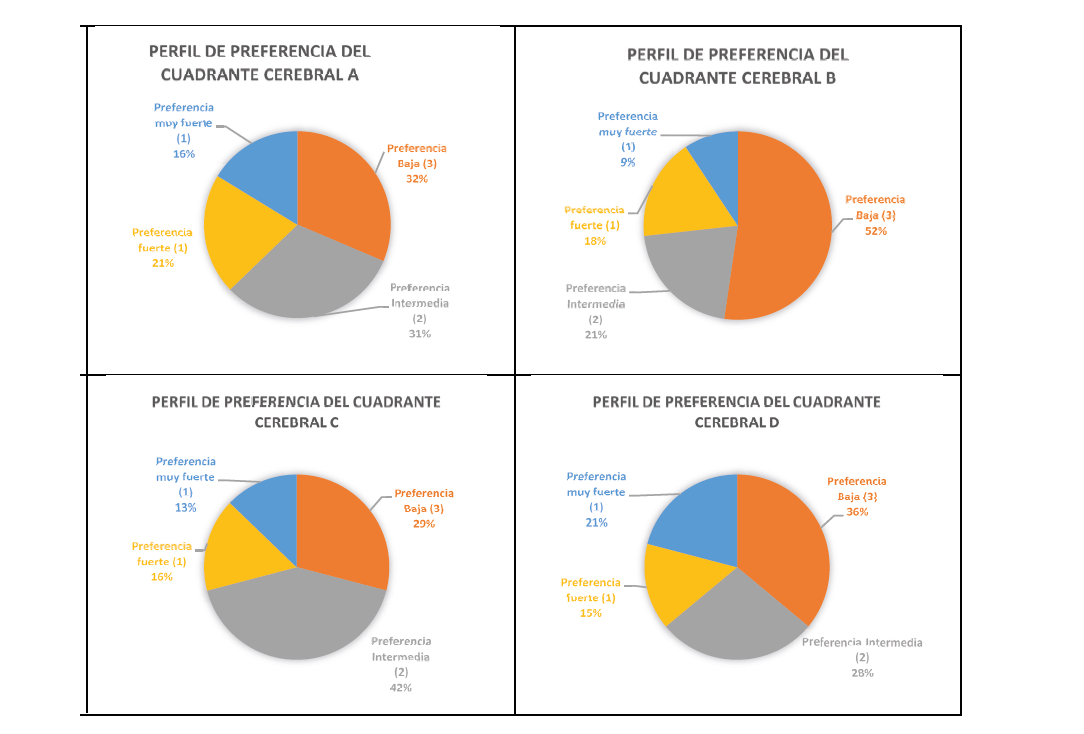 De los gráficos de la figura 4 presentados se observa que los estudiantes que tienen un perfil de preferencia del cuadrante cerebral A, el 32 % preferencia baja, el 31% preferencia intermedia, el 21 % preferencia fuerte y el 16 % muy fuerte. Los estudiantes del perfil de preferencia del cuadrante cerebral B, el 52% tiene preferencia baja, el 21% preferencia intermedia, 18% preferencia fuerte y preferencia muy fuerte el 9%. De la encuesta efectuada los alumnos tienen una preferencia del cuadrante cerebral C, muy fuerte 13%, preferencia fuerte 16%, preferencia baja 29% y preferencia intermedia 42%. Los estudiantes muestran un perfil de preferencia del cuadrante cerebral D, muy fuerte el 21%, preferencia fuerte 15%, intermedia 28% y preferencia baja del 36%. Un hallazgo es que en los cuatro cuadrantes en mayor porcentaje es la preferencia intermedia. Como evidencia se tiene que en los cuadrantes A, C y D se tiene que el mayor porcentaje de estudiantes presentan preferencia intermedia, mientras que en el cuadrante B la preferencia baja tiene el mayor porcentaje y en segundo lugar la preferencia intermedia.