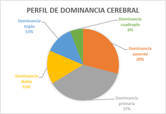 Para la muestra total en el gráfico 5 se visualiza que los estudiantes muestran un perfil de dominancia cerebral, cuádruple el 6%, triple 13%, doble 15%, primaria 37% y ausente 29%.