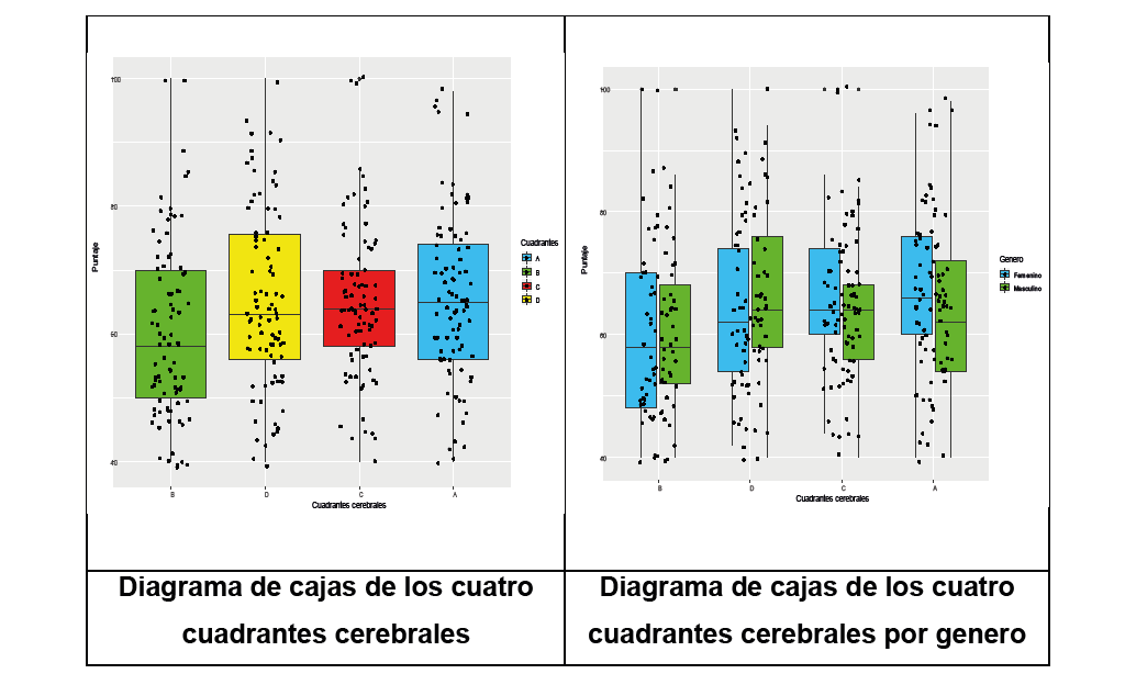 De los resultados del diagrama de caja se obtiene que los cuadrantes cerebrales A, B y D tienen una distribución sesgada a la derecha a excepción del cuadrante C, este resultado se da por que la media es mayor que la mediana, en el diagrama de cajas por cuadrantes cerebrales y sexo se visualiza una distribución diferenciada en el cuadrante C de los datos, siendo para el sexo femenino una distribución sesgada a la derecha, siendo estudiantes emocionales, sensoriales, resumiendo en una sola palabra "sentimentales" en comparación al sexo masculino que tienen una distribución sesgada hacia la izquierda lo que indica pensamiento contrario a las mujeres, para los demás cuadrantes presenta una distribución sesgada hacia la derecha en ambos sexos, de la misma forma se obtiene que el perfil de preferencia en mayor porcentaje, para el cuadrante A se presenta la preferencia fuerte con 32%, para el cuadrante B el 52%, con preferencia baja, para el cuadrante C la preferencia intermedia con 42% y el cuadrante D la preferencia baja con 36%. Los estudiantes muestran un perfil de dominancia cerebral, cuádruple el 6% es decir preferencia fuerte en los cuatro cuadrantes cerebrales del modelo del cerebro total de Herrmann, triple 13%, doble 15%, primaria 37% y se encontró que los estudiantes en un 29% presentan una dominancia ausente o evitan.