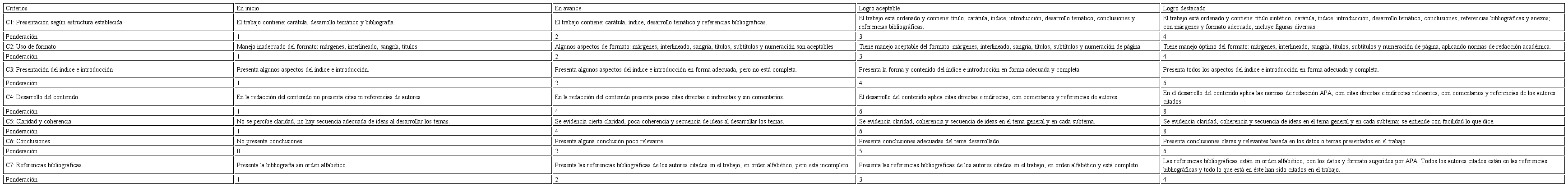 c) Rúbricas para la valoración de ensayos académicos (ver anexo)