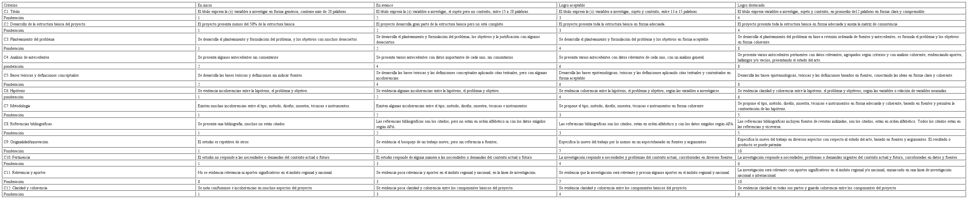 Para el nivel de posgrado se han elaborado y validado dos rúbricas: la rúbrica para evaluación de proyectos de tesis y la rúbrica para la evaluación de artículos académicos.