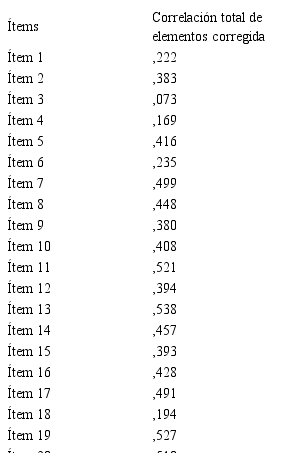 Los resultados (tabla1) nos muestran valores superiores a ,22 a excepción de los ítems tres, cuatro y 18, los cuales necesitan ser revisados para futuros estudios.