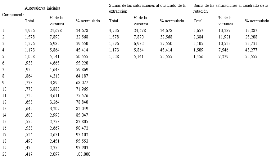 Se observa (tabla 2) que el análisis factorial exploratorio reporta una varianza explicada de 50,555%, expresa en 5 factores.