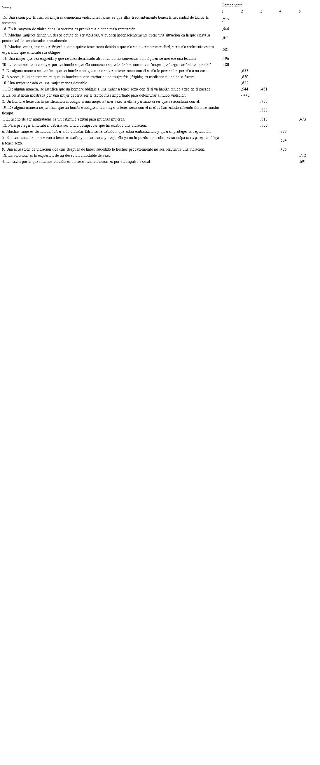 Abstract: The present study was developed in order to determine the psychometric properties of favorable attitudes scale towards rape (RSAS). The sample was made up of 354 students from 18 to 30 years old, from a private university in the city of Chimbote, Peru. The results, at a general level, indicate that the scale structure presents five factors in the studied population, reaching internal consistency coefficients higher than 0.80 value. Regarding validity, three items deserve to be reviewed in subsequent studies. In conclusion, it is stated that the RSAS scale at a general level presents an adequate psychometric quality.