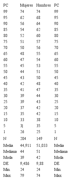 Se observan las normas tipo percentil (tabla 5) de la Escala de actitudes favorables hacia la violación construida en base a 354 estudiantes universitarios, de los cuales 149 son varones y 204 mujeres.