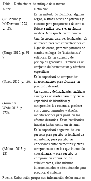 Como puede inferirse, entonces, el enfoque de sistemas es una forma de pensar en sistemas de todo tipo. No es una disciplina con fronteras definidas, lo cual, señala Korn (2019), es una de sus debilidades, pues comprende un marco conceptual interdisciplinario que puede adaptarse a diferentes áreas del conocimiento (Shaked y Schechter, 2017). La característica esencial de esta forma de pensar es que el pensamiento interviene desde el inicio para dictar la manera en que nosotros describimos lo que pensamos hacer. Es decir, debemos preguntarnos desde el inicio cómo pensar acerca de un sistema y nuestra forma de pensar nos dirá cómo describiremos el sistema (Islas y Lelis, 2007). Ahora bien, esta flexibilidad y versatilidad ventajosas para el enfoque sistémico ha llevado a una amplia gama de definiciones que a continuación se presenta en la tabla 1.