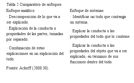 El enfoque de sistemas es un método para resolver problemas, donde estos no se pueden reducir a simples relaciones de causa y efecto, pues requiere una comprensión más amplia de las interacciones, de las relaciones y los comportamientos entre los elementos que caracterizan al sistema. Un sistema menciona Ackoff (2008) es un todo que no debe ser dividido en partes independientes; de ahí que, se derivan dos propiedades importantes de los sistemas. La primera, un sistema tiene propiedades que desaparecen cuando se separan del sistema; la segunda, cada sistema tiene propiedades esenciales, que no tiene ninguna de sus partes. Es así, que las propiedades esenciales de un sistema derivan de las interacciones de sus partes, por eso, cuando un sistema es separado pierde sus propiedades esenciales. Por lo tanto, un sistema no puede ser comprendido por medio del análisis o reduccionismo. A continuación se presenta el orden del enfoque analítico y de sistemas a tratar de entender un problema en tabla 2.