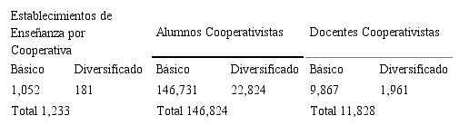 En Guatemala, la cobertura educativa en el nivel medio correspondiente al año 2018 fue precario, con un 43.25% en el ciclo básico y 24.90% en el diversificado, lo que unido al índice de analfabetismo (12.31%) que equivale a 1 millón 241 mil 32 guatemaltecos que no saben leer ni escribir (Aceña y Menchú, 2019, p. 13; López, 2017), lo que muestra la incapacidad del gobierno de crear centros escolares que atiendan a este sector de la población, por lo que, es frecuente que las cooperativas hayan creado sus propios establecimientos de enseñanza para impartir educación formal (ver tabla 4).