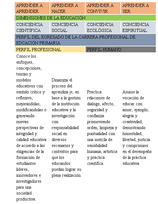 La definición del perfil de egreso comprende dos aspectos: La primera es la formación humana, referido al desarrollo de la interioridad para ser y sentir como ser individual y como ser social (Aprender a ser y aprender a convivir); la segunda es la formación profesional, preparación para saber y hacer, que son las competencias y capacidades para el desempeño profesional (Aprender a aprender y aprender a hacer) (Delors, J., 1997; Diseño Curricular, 2018).