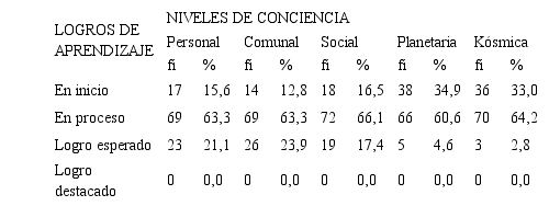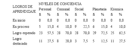 Según las tablas 5, 6, 7 y 8; los estudiantes que concluyeron su formación inicial docente de la Carrera Profesional de Educación Primaria, donde se implementó la visión holística de la educación para el desarrollo multinivel-multidimensión de los estudiantes, con equipo de docentes comprometidos en innovación de la formación integral desde el año 2015; cuyos resultados permiten determinar que los efectos del proceso de formación son muy significativos. Así tenemos que de acuerdo al promedio de puntuación alcanzado, el 80% de estudiantes se ubican en el logro esperado, el 15% de ellos en logro destacado y el 5% en proceso de logro de los niveles de conciencia. Así tenemos en el desarrollo del nivel de conciencia personal el 27% de los estudiantes muestran logro destacado, el 57% de ellos logro esperado y permanecen en proceso de logro 15% de estudiantes; respecto a conciencia comunal el 20% de estudiantes alcanzaron logro destacado, el 70% de ellos logro esperado y el 10% en proceso de logro; en nivel de conciencia social el 70% de estudiantes se ubican en logro esperado, el 22,5% de ellos en proceso de logro y el 7,5% de estudiantes muestran logro destacado; en nivel de conciencia planetaria el 72,5% de los estudiantes alcanzaron logro esperado, el 15% se ubican en proceso de logro y el 12,5% de ellos logro destacado; y, en nivel de conciencia kósmica el 62,5% de estudiantes muestran logro esperado, el 27,5% muestran logro destacado y el 10% de ellos en proceso de logro.