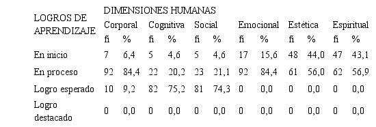 El aprender a aprender, aprender a hacer, aprender a convivir y aprender a ser (Delors, 1997), constituyen aprendizajes estratégicos que los estudiantes requieren para enfrentar a la sociedad en que vivimos y esperamos vivir; por ello, en el proceso de formación inicial del profesorado debe priorizar el desarrollo integral bajo la visión holística de la educación multinivel-multidimensión (Barrientos, 2018; Gallegos, 2003a). El proceso de formación integral, requiere de espacios y contextos educativos influyentes en el desarrollo de las seis dimensiones humanas y cinco niveles de conciencia. Estos escenarios son determinantes en el logro del perfil humano y profesional del profesorado que egresa de las instituciones formadoras; siendo componentes facilitadoras del proceso de formación tales como: el modelo educativo que se asume, la disciplina educativa (orden, limpieza y puntualidad), el compromiso en la docencia en su vocación de enseñar y educar a través del ejemplo, el estudiante como eje central respecto a su aprendizaje y la práctica de valores y sistema de evaluación como herramienta inherente al proceso de formación para la toma de decisiones oportunas respecto a la enseñanza y aprendizaje. Sin duda, aún subsisten serios problemas tanto en el funcionamiento de las instituciones como en el perfil de sus cuerpos docentes y en la organización, planificación y conducción del subsistema formador, de nada sirve las reformas curriculares (Vezub, 2007). El manejo descontextualizado de estos componentes en el proceso de formación docente no contribuye en el desarrollo multinivel - multidimensión del estudiante; así como se observa en los resultados de 109 estudiantes que concluyeron su formación inicial docente en diciembre de 2019, donde el 90,8% de ellos en promedio se ubican en proceso de logro de los niveles de conciencia y el 93,6% de los estudiantes en promedio se ubican en proceso de logro de las dimensiones humanas; identificándose en las dimensiones cognitiva y social el 75,2% y 74,3% respectivamente el logro esperado; mientras tanto, en la dimensión corporal, emocional, estética y espiritual el 84% y 56% de estudiantes están en proceso de logro. Esto se debe al proceso de formación docente bajo la visión fragmentaria - mecanicista de la educación que no contribuye significativamente en la formación integral del profesorado. Sin embargo, los resultados de 40 estudiantes evaluados de la Carrera Profesional de Educación Primaria demuestran logros significativos en el desarrollo de los niveles de conciencia y las dimensiones humanas.