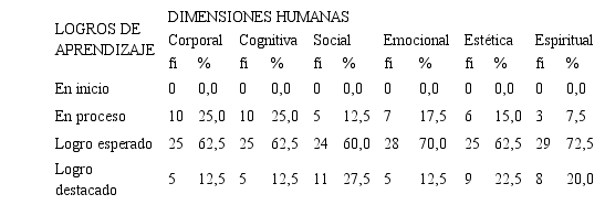 Respecto al desarrollo de las dimensiones humanas, en promedio de puntuaciones se observa, que el 77,5% de los estudiantes se ubican en logro esperado, el 15% de ellos en logro destacado y el 7,5% en proceso de logro. En la dimensión espiritual (Aprender a ser) el 72,5% de los estudiantes han alcanzado el logro esperado, el 20% de ellos se ubican en el logro destacado y sólo el 7,5% de los estudiantes se ubican en proceso de logro; respecto a la dimensión emocional, el 70% de estudiantes muestran logro esperado, el 17,5% de ellos en proceso de logro y el 12,5% de los estudiantes en logro destacado. Cabe aclarar que estas dos dimensiones (Emocional y espiritual), son las que consolidan el perfil humano con mayor significancia, porque para aprender a educar y enseñar es importante que los futuros docentes aprendan a gestionar sus emociones y aprendan a ser como personas, permitiendo a educar a convivir y aprenden a educar a ser (pedagogía de la interioridad) que se concreta bajo la pedagogía del ejemplo (Alonso, 2011; Barrientos, 2018; Delors, 1997). En la dimensión corporal, cognitiva, social y estética alcanzaron el 62,5% de los estudiantes el logro esperado, 12,5%, 22,5%, 27,5% y 25% respectivamente se ubican en el logro destacado, observándose aún por debajo de los 15% de ellos en proceso de logro. Aquí precisamos respecto al desarrollo de las dimensiones cognitiva y social, que consolida el perfil profesional para aprender a enseñar, para cumplimiento de funciones (Pedagogía de cumplimiento) como docentes de aula (Aprender a aprender y aprender a hacer), lo que se conoce como pedagogía de la exterioridad (Alonso, 2011; Delors, 1997).