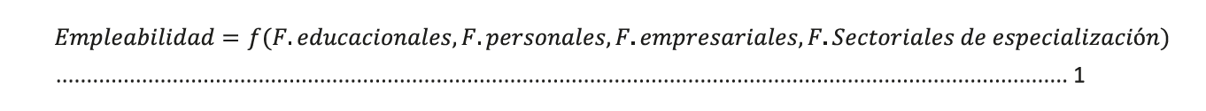 La figura 2 muestra un conjunto de factores determinantes de la empleabilidad que son parte de una recopilación y síntesis de algunos estudios más resaltantes sobre este tema y se plantean en la siguiente forma funcional[2]: