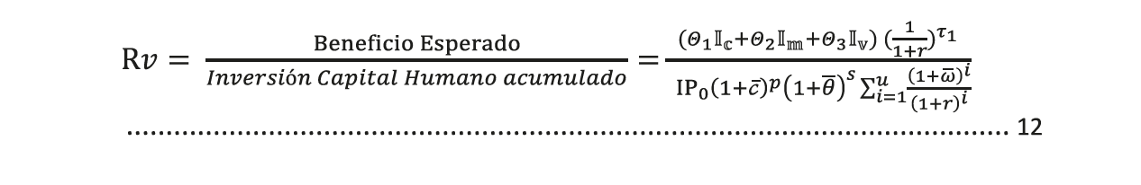 Rentabilidad esperada: La ecuación 12, muestra la rentabilidad esperada actualizada que obtendría un individuo por sus ingresos futuros (numerador) y por su inversión en educación (denominador).