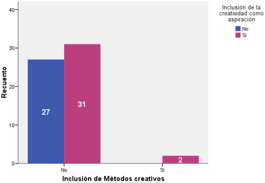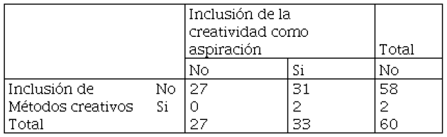 Como puede apreciarse de los 60 PEI analizados 27 no incluyen la creatividad ni como aspiración ni como métodos creativos, 31 aunque la incluyen como aspiración no lo hacen como método, ninguno la incluye como método sin haberla incluido como aspiración y solo 2 la incluyen en ambos casos.