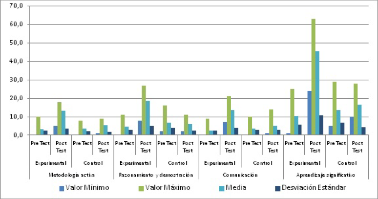 En el cuadro N° 1: se observa en lo que se refiere a la dimensión metodología activa, en el grupo experimental antes de la aplicación del software CURVE EXPERT en el pre test el 12% de los estudiantes se encontraban en el nivel proceso y el 88% en el nivel inicio. En el pos test el 20% de los estudiantes se encuentran en el nivel logro destacado, 44% en el nivel logro previo, 32% en el nivel proceso y 4% estudiante en nivel inicio. Estos resultados evidencian que hay una mejora en el desarrollo del aprendizaje significativo en lo que se refiere a su dimensión, metodología activa, una mejora significativa de 3 estudiantes que logran un nivel logro destacado, 16 estudiantes que logran posesionarse en el nivel logro previo, aumenta el número de estudiantes en el nivel proceso de 3 a 5 y finalmente se logra que de 23 estudiantes en el nivel inicio se disminuya a 2 estudiantes de una muestra de 25 estudiantes