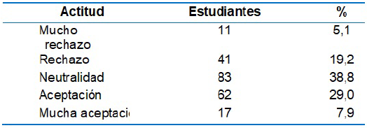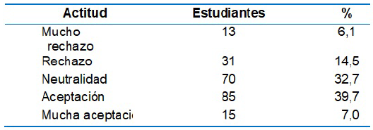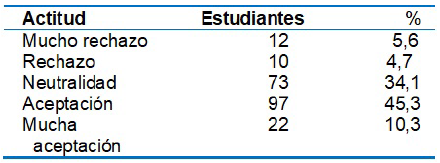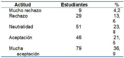 En la tabla 1 y figura 1 se aprecia que la actitud hacia la conservación ambiental de las estudiantes es predominantemente de aceptación (39,7%), el 32,7% fueron indiferentes o neutrales, el 14,5% mostraron rechazo, el 7% mucha aceptación y el 6,1% mucho rechazo.