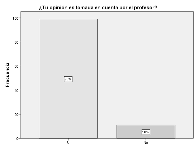 La mayoría de los estudiantes (90%) considera que la opinión dada por ellos durante la clase es tomada en cuenta por el docente, ( gráfica 3), lo que se traduce en Liderazgo Democrático, el 10% restante percibe un estilo de Liderazgo Laissez-Faire caracterizado por ??delegación del poder, desinterés y evasión de responsabilidad?. ( Pacsi, Estrada, Pérez y Cruz, 2014, p.69).