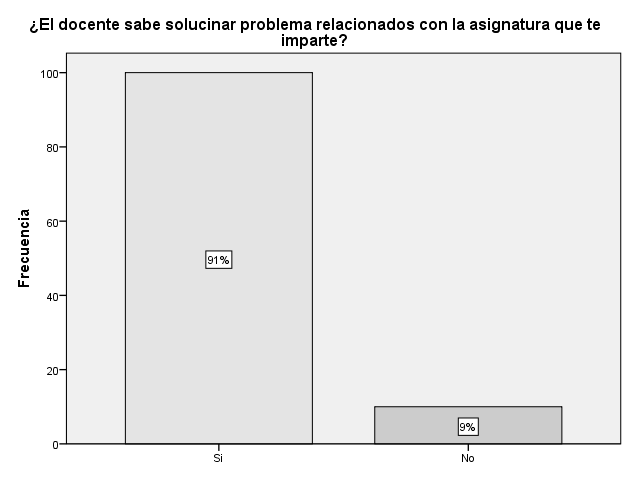 A la pregunta sobre si el maestro sabe solucionar problemas relacionados con la asignatura que imparte, el 91 % respondió afirmativamente, de acuerdo con Rodríguez-Molina, el docente es un líder nato ?El líder pedagógico? centra su quehacer educativo en: formular, hacer seguimiento y evaluar las metas y objetivos?? (2011, p. 257), es decir, cuenta con las herramientas para solucionar los problemas que se le presenten a lo largo de su desempeño académico.