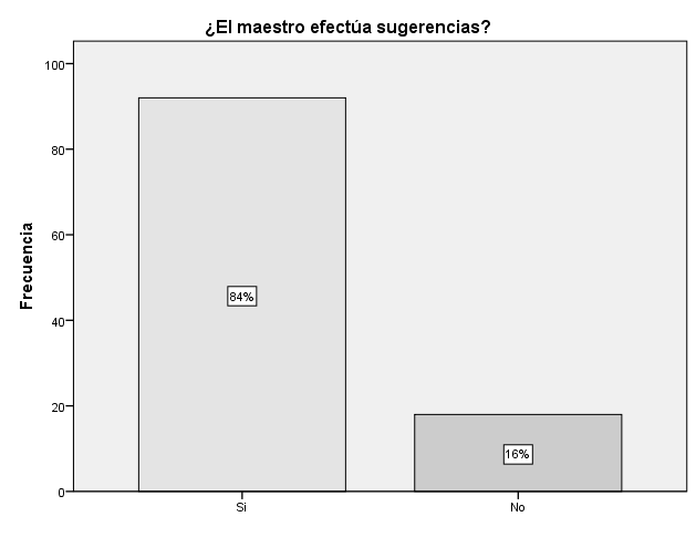 89% de los encuestados considera que sus profesores efectúan sugerencias dentro del salón de clases. Estas sugerencias tienen como principal objetivo orientar al estudiante dentro de su aprendizaje, a fin de lograr mejores resultados. Los resultados se muestran en la gráfica 5.