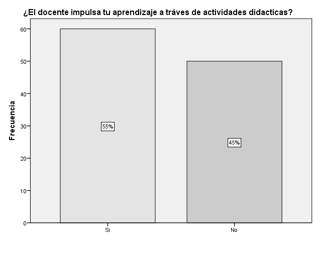 Para el 55% por ciento de los participantes, el docente impulsa el aprendizaje a través de actividades didácticas, como se muestra en la gráfica 6. El empleo de estas actividades busca fijar los conocimientos en quienes las practican, ya que ?La mejor manera de conseguir una formación adecuada para nuestros estudiantes es inducir en ellos una participación activa en el proceso de enseñanza/aprendizaje, a través de la práctica y la experimentación? (Costa y Dorrío, 2010, 466).