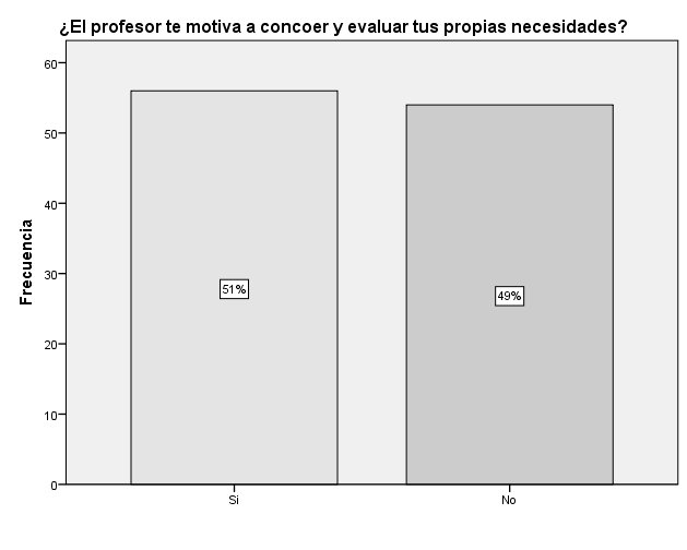 Cuando se les cuestionó si el profesor los motiva a conocer y evaluar sus necesidades, el 51% respondió que sí. Al respecto Hué (2012, p. 49) señala que esto se logra cuando los estudiantes aprenden a desarrollar un juicio propio, una actitud positiva en relación con situaciones complejas de la vida, cómo y cuándo reaccionar. Sin embargo el 49% señaló que el docente no lo motiva a conocer y evaluar sus necesidades. El tipo de liderazgo predominante en estas respuestas es el Laissez-Faire también llamado no liderazgo caracterizado porque el líder retrasa las decisiones ( Álvarez, Castillo y Falcó, 2010, .p. 220). Los resultados se muestran en la gráfica 8.