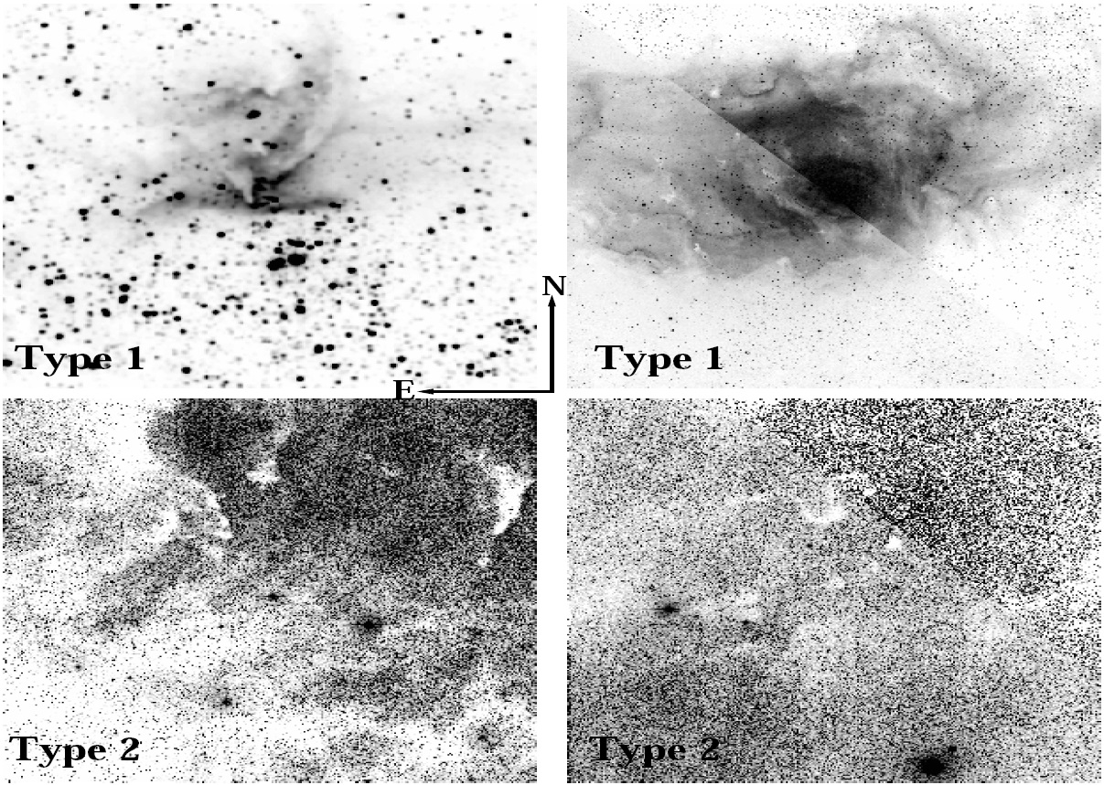 From Tables 1 and 2 , we conclude that the num- ber of type 1 systems is about twice that of type 2 radial systems. During our survey of the Northern Hemisphere, we discovered 17 type 1 and 6 type 2 radial systems, a slightly larger ratio. From the results of both surveys, we can conclude that the quantity of type 1 radial systems is about 2.5 times greater than that of type 2 radial systems. Figure 1 shows some example images of the new type 1 and type 2 radial systems found in this study.