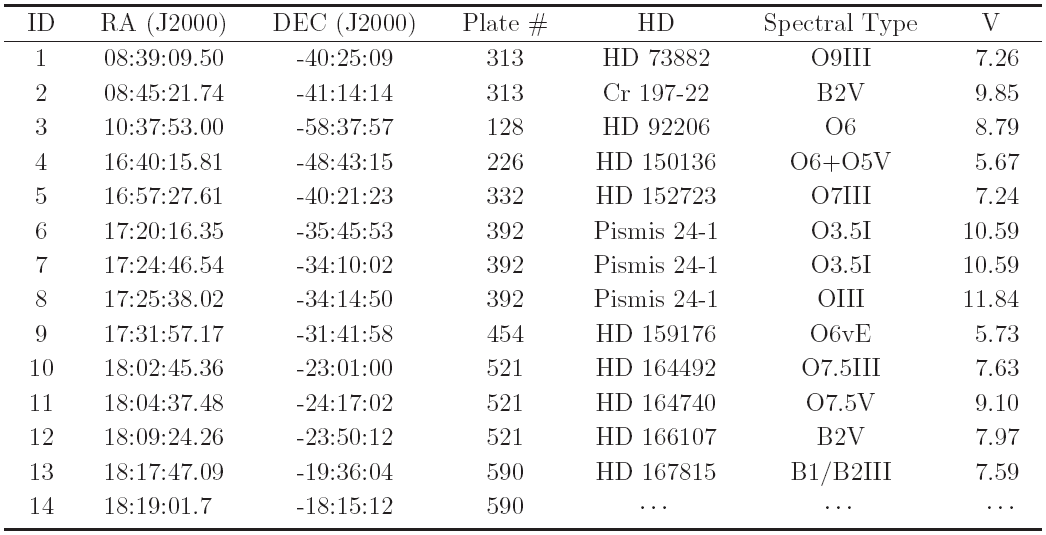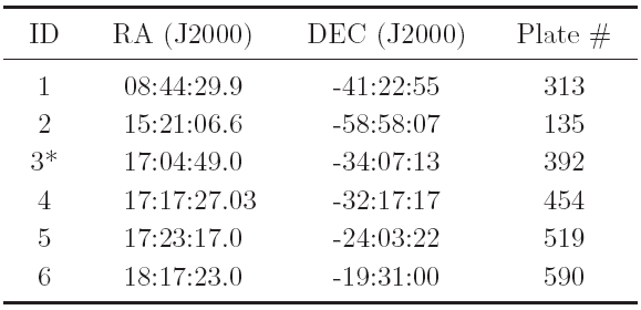 In Table 2 , Column 1 shows the sequential number of the radial system, Columns 2 and 3 show the approximate coordinates of the center of the system, and Column 4 shows the number of the plate on which the radial system was discovered. Object ID=3 (marked with an asterisk in the Table) has been included in the list of type 2 systems because even though it has a bright star in its center (HD 154090 with spectral type B1Iae− B2Iae), it has no discernible optical HII region and no bright rims at the edge of the dark globules. This object might actually be intermediate between a type 1 and a type 2 system.