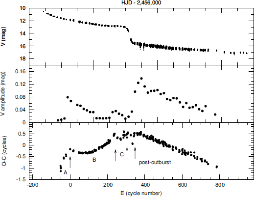 Once the main eruption was over, the light curve was still dominated by superhumps, but now with significantly larger amplitude (≈ 0.15 mag) which decreased slowly (≈ 0.013 mag d−1). This behaviour remained essentially unchanged for nearly 20 days of our observations after the main fading.