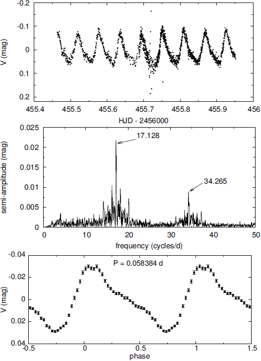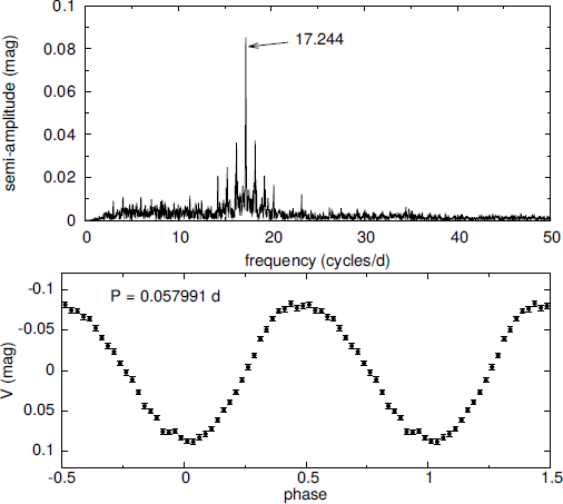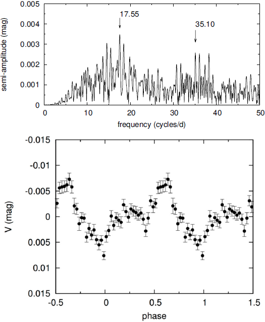 We formed a spliced light curve including all the observations from day HJD ≥ 473, and found a power spectrum (shown in the upper frame of Figure 4), with a peak at 17.244(1) cycles d−1. This was interpreted as the frequency of the post-outburst superhump, and dominated the spectrum. Higher-order harmonics were also found, but their amplitude was very low (< 0.0065 mag). This signifies that the waveform of the post-outburst superhump was nearly sinusoidal. The lower frame of Figure 4 shows that this was indeed the case.