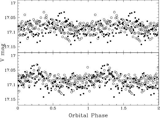 As detailed in § 2, we took two runs near minimum light covering around one orbital period each. The light curves are shown in the upper panel of Figure 5. When folded with the orbital period (0.05698 d), the light curves seem to be out of phase. But this is not surprising: over the 23 days (nearly 400 orbital cycles) elapsed between both runs, an uncertainty of 0.0001 days in Porb involves an uncertainty of 0.7 in phase. We carried out a period analysis of both nights using the Phase Dispersion Minimization (PDM) technique (Stellingwerf 1978) in the Peranso package (Paunzen & Vanmunster 2016). This technique is frequently used to detect variations of superhumps in SU UMa systems (e.g. Kato et al. 2014). The lower frame in Figure 5 shows the results of combining the two nights with the best period estimate (0.0576 d) determined from the PDM technique. Assuming that the observed light comes from the accretion disc, the zero point obtained in this case is HJD 2456537.6946 (time of inferior conjunction of the secondary). The period found using the PDM method yielded a value which is still close to the post-outburst state, but the sinusoidal shape is gone. There was only a small peak around phase 0.25. No double modulation with orbital period was found as would be expected in a bounce-back object. Further observations in the R band were obtained on 2018, July 18 covering three orbital cycles. Since the night was not photometric, we were unable to make absolute calibrations and only differential photometry is shown in Figure 6. No obvious orbital modulation was detected within the individual errors, which are rather large (≈ 0.03 mag).
