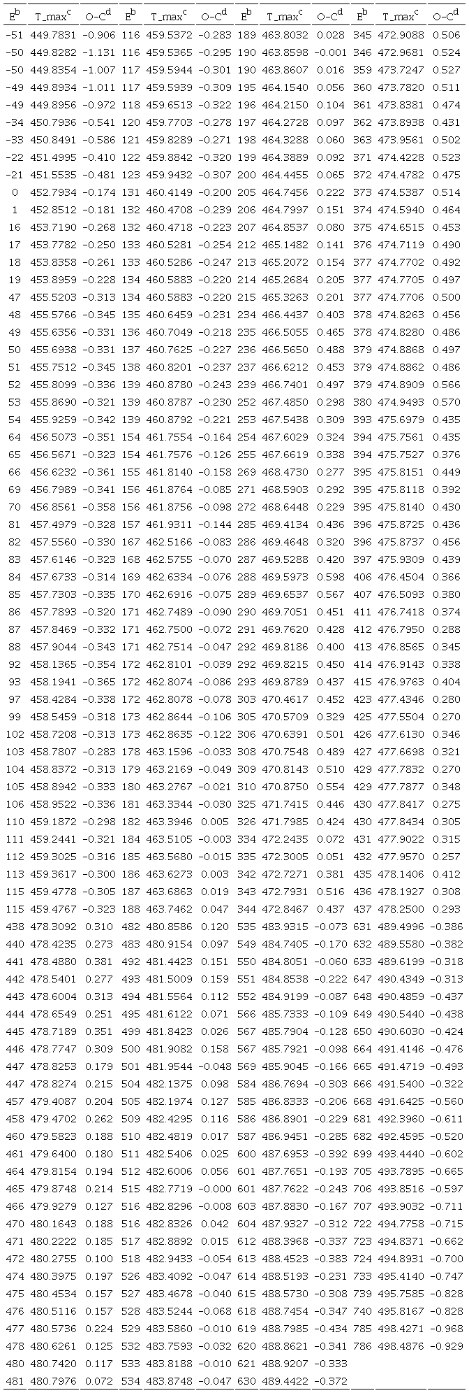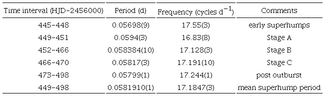 After this general analysis, a detailed explanation of these stages was made. First, we derived the timings of superhump maxima. A total of 310 times of superhump maxima was identified in the light curves in the interval HJD 449.6-498.6 days. These maxima are shown in Table 1. The early stage of the eruption was not considered, since the signal there was of very low amplitude and individual maxima were not well defined. A linear regression to these timings provides the following test ephemeris: