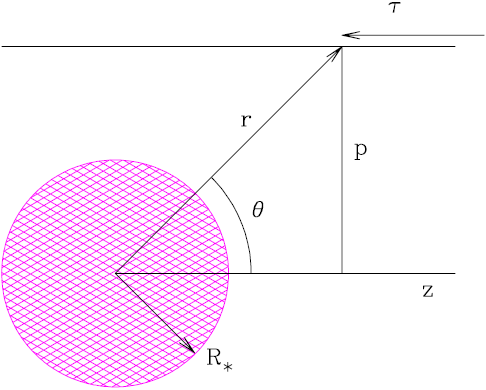 Figure 1 shows the geometry for evaluating the optical depth τ along a ray. Cylindrical coordinates for the observer are (p, α, z), with the observer located at great distance along the +z-axis. Spherical observer coordinates are (r, , α), with r2 = p2 + z2. The continuum optical depth along a ray of fixed impact parameter, p, is