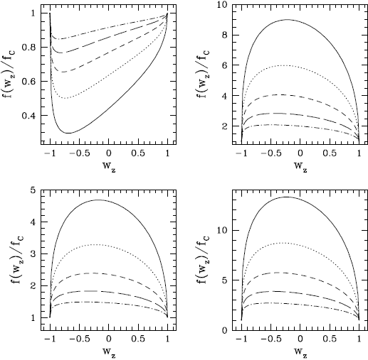 Figures 2-4 provide illustrative results for line profile shapes. Figure 2 shows results for m = −0.5 (i.e., clumping that increases with radius); Figure 3 for m = 0 (i.e., clumping that is constant with radius); and Figure 4 for m = +1 (i.e., clumping that declines with radius). Each figure has 4 panels: upper left is for δLC = −0.15, lower left is for δLC = +0.23, upper right is for δLC = +0.62, and lower right is for δLC = +1.0 for Figures 2 and 3, but δLC = −0.1, 0.4, 0.9, and 1.4 for Figure 4. Each panel has 5 line profiles, with tLC = 0.32, 0.56, 1.0, 1.8, and 3.2, from the weakest line to the strongest. The profiles are continuum normalized and plotted against velocity shift, wz. Note that each panel has a different ordinate scale.