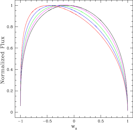 For , the line profiles are more symmetric about line center as compared to either or . As approaches , the line profile becomes perfectly symmetric, because the factor contributing to the line asymmetry cancels exactly when . As increases, the line shapes become increasingly asymmetric with the line skewed preferentially toward blueshifted velocities. This is natural generally because the attentuation of line emission from the far-side hemisphere of the wind is greater than from the near-side hemisphere. When , absorption is exactly compensated by emission, and no asymmetry in the line can result. For the given assumptions, the line asymmetry occurs only when the source functions are unequal.