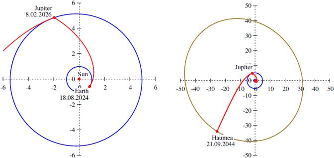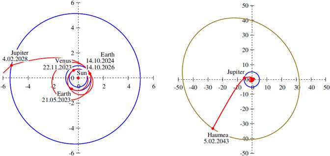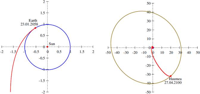 Since inclination of the Haumea orbit to the ecliptic plane is about 28.2 degrees, the direct transfer to this body would have its minimum fuel consumption if the spacecraft reaches Haumea at the node line, i.e., the intersection of the Haumea orbital plane with the ecliptic plane. The reason is the very high cost of maneuvers to change the inclination of the spacecraft orbit. Then, the first trajectory presented in Table 2, the EHnc (type A), is a direct transfer using the best scenario, with the launch date of (23.01.2058) and the arrival date of (11.03.2100), just when Haumea is passing by the line of nodes. In Table 2, VL is the launch , VA is the arrival velocity, T is the total , and TOF is the time of flight. Figure 1 shows the trajectory for the direct transfer.
