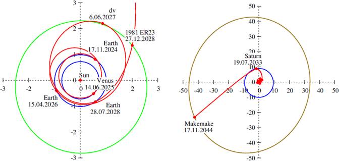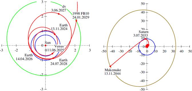 However, if we consider the EVEdvE maneuver before the Saturn or Jupiter swingby, our simulations show that Saturn is more efficient in terms of reducing the total . In the same way as transfers to Haumea, a 20-year transfer is feasible if a mission passing by multiple bodies is designed, having the total around 10 km/s. Therefore, regarding the search of asteroids that can be encountered in the way from Earth to Makemake, the F2 transfer (EVEdvESM20y) is chosen. This transfer is shown in Figure 9. Three asteroids can be encountered with an additional of less than 1 km/s, which is not too much considering the scientific gains of the mission. The asteroids are: (96168) 1981 ER23, with an additional of only 0.04 km/s; (12062) 1998 FB10, with an additional of 0.12 km/s; and (135420) 2001 UT44, with additional of 0.14 km/s. The transfer trajectories reaching these three asteroids are shown in Figures 10, 11, and 12, respectively.