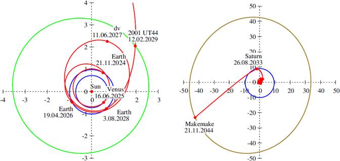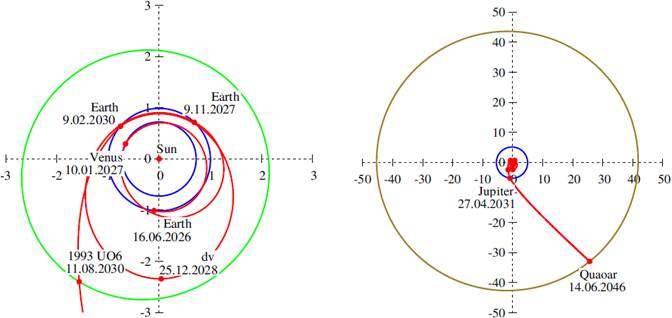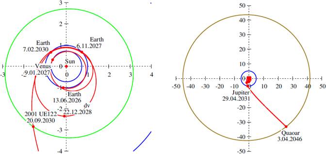 Two asteroids can be reached with an additional ΔV of around 1 km/s, a value that is not too large. The asteroid (155385) 1993 UO6 can be reached with an additional V of only 0.26 km/s, while the asteroid (64378) 2001 UE122 can be visited with an additional ΔV of 1.13 km/s. The transfers that contain the passage by these asteroids are shown in Figures 15 and 16, respectively. The orbital geometry of the transfers to Quaoar also allows both Jupiter and Saturn swingbys. In a transfer with 30 years of time of flight, the total ΔV is 5.39 km/s; reducing this limit to 25 years, the total ΔV is increased to 8.71 km/s; and, finally, with a limit of 20 years, the total ΔV goes up to 17.68 km/s. This sensitive growth of the total ΔV in a period of five years of time of flight indicates that the alignment of Jupiter and Saturn allows only a limited launch window for these transfers. This also indicates that the trajectory using 25 years and a total ΔV less that 10 km/s is a rare opportunity.