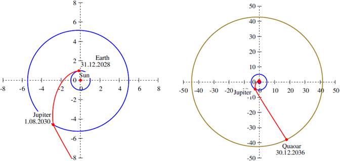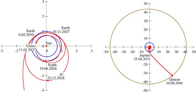 Characteristics of the transfers to Quaoar are given in Table 4, where ΔVL is the launch ΔV, VA is the arrival velocity, ΔVT is the total ΔV, and TOF is the time of flight. The orbit of Quaoar has a semi-major axis of 44 astronomical units, and this number places its orbit between the orbits of Haumea and Makemake, because the eccentricity of Quaoar is low. However, the orbital inclination of Quaoar to the ecliptic plane is 8 degrees. In this case, due to the lower inclination compared to Haumeaand Makemake, all transfer trajectories from Earth to Quaoar have fuel consumption, expressed by the total , smaller than the ones required for the transfers to Haumea or to Makemake. This fact can be seen if Tables 2, 3, and 4 are compared with each other. To exemplify this fact, the transfer using a Jupiter swingby and considering a 10-year time of flight can be used for comparisons. In the case of Haumea, this transfer requires a total ΔV of 9.98 km/s to be executed. For Makemake, the value is ΔV = 10.43 km/s; while for Quaoar it is ΔV= 8.34 km/s. Since, in this paper, we fixed a limit of 10 km/s for the total ΔV , it is possible to obtain a transfer to Quaoar with a flight time of 8 years and total ΔV = 9.73 km/s. This means that Quaoar can be reached in less than a decade of flight, which makes it a very convenient target. Figure 13 shows the 8-year Earth-Jupiter-Quaoar transfer.