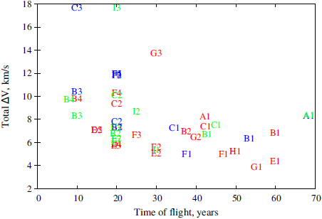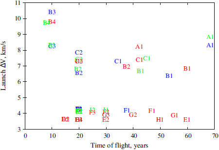 The patched-conic technique, making close approaches of the spacecraft to the planets of the Solar System, is used to generate sets of trajectories between Earth and Haumea, Makemake, and Quaoar. The software implemented to solve this problem generates all possible trajectories between the Earth and the final destination, choosing as optimal trajectory the one with the minimum required, for a given a launch window. This means that extended launch, swingby, and arrival time windows, up to a few and sometimes several months, were specified and optimal transfers within the windows were sought for. Thus, the trajectories found are optimal from the fuel consumption point of view. As mentioned above, this minimum does not consider the required to place the spacecraft in a close orbit around the dwarf planet, since the arrival velocity is too high: it can vary from 10 km/s to 22 km/s in trajectories with 10 to 20 years of time of flight, as shown in the next section. Then, the minimum to generate the optimal trajectory comprises the launch and mid-course maneuvers. The orbits of the planets were calculated using the JPL DE405 ephemerides. Orbital elements of the dwarf planets were taken from the Edward Bowell’s Asteroid Orbital Elements Database and then numerically propagated to the arrival time. In order not to make the transfers too long the time of flight was limited by some values and the optimal transfers (i.e. transfers with minimal total ) for that limited time of flight were calculated.