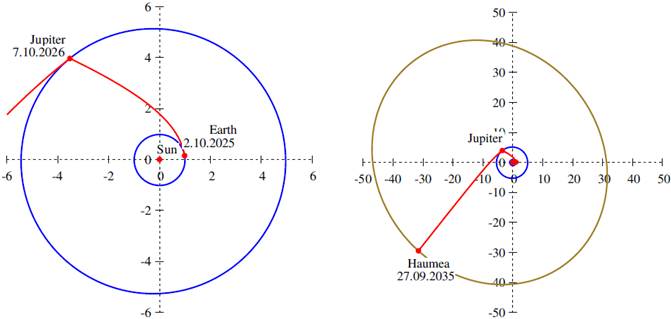 Since Haumea, Makemake, and Quaoar are KBOs, all transfer trajectories pass by the main asteroid belt. This makes it possible to encounter and observe a main belt asteroid (or asteroids), increasing the scientific output of the mission. However, since the trajectories with smaller time of flight pass through the main belt with high velocity, the additional required to encounter an asteroid could increase too much the total . This is why only the 20-year trajectories include possible encounters with the asteroids. The results are shown for each individual target. The next three subsections give the main results for the trajectories to Haumea (Table 2), Makemake (Table 3), and Quaoar (Table 4). Plots of some of the trajectories are also shown, to illustrate the transfers. The results are summarized in the last subsection. All the dates presented in the results are in format dd.mm.yyyy, where dd = day, mm = month and yyyy = year.