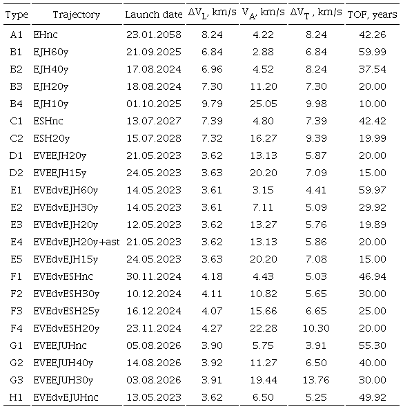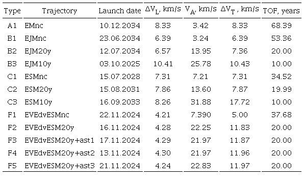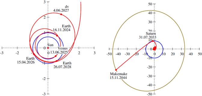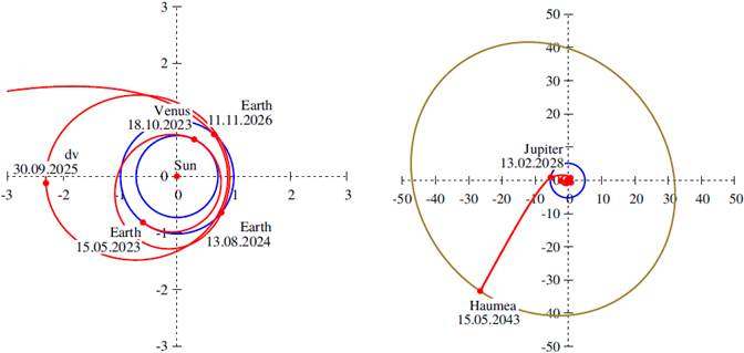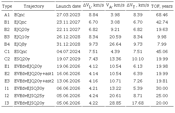We analyzed the dates of launch in the 2023-2034 interval. The only exception was direct flight to Haumea with launch in 2058. The optimal transfer trajectories in terms of the minimum fuel consumption were found. Instead of the fuel consumption an equivalent parameter was considered, namely the total , which is the sum of the launch V in the low Earth parking orbit and all necessary s during the flight.4 This was done considering various possible transfer schemes for the given launch windows assuming that the dwarf planets will be flown by without capture. If capture is required for these specific trajectories, a new optimization should be made taking into account the capture maneuver. Most of the transfer schemes considered include various gravity assists of the planets, which lowers the fuel consumption and/or shortens the time of flight. Furthermore, multi-body missions are more interesting from the scientific point of view, since scientific data could be acquired during the flybys. However, since the limited time of flight is considered, the number of bodies in a single trajectory may be limited. Thus, the number of the planets was maximized for trajectories with 20 years of total time of flight, leaving a smaller number of planets for trajectories with total time of flight less than 20 years. The main difficulty in the design of these trajectories is to find feasible combinations of planets, within the proposed time interval, in a realistic time of flight. Some combinations are not always possible. For example, the combination used by the mission of the Voyager 2 (Kohlhase & Penzo 1977), Earth-Jupiter-Saturn-Uranus-Neptune-Outer space, cannot be reproduced in this century anymore. This technique was widely used in missions to the outer planets and outer space, such as in the Voyager 1 (Kohlhase & Penzo 1977), with the scheme E-J-S-Outer space, Galileo (D’Amario et al. 1982), with the scheme E-V-E-E-A-A-J, Ulysses (Wenzel et al. 1992), with the scheme E-A-DV-E-A, Cassini (Peralta & Flanagan 1995), with the scheme E-V-V-E-A-J-S, and the New Horizons (Guo & Farquhar 2005), with the scheme E-A-J-P-Kuiper Belt, where E, V, J, S, U, N, P, A stand for Earth, Venus, Jupiter, Saturn, Uranus, Neptune, and anăasteroid, respectively.ăDV means a deep space propulsive maneuver. All of these schemes, except E-V-V-E, which areăpossible for launch in 2023-2034 areăanalyzed in this paper. Also transfer schemes E-V-E-E-S andăE-V-E-DV-E-S are considered.