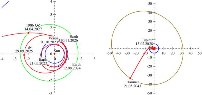 The EVEdvEJH20y transfer trajectory that uses the deep space maneuver is shown in Figure 5. The use of the deep space maneuver between the two Earth swingbys leads to a small decrease of the total , namely, of 0.11 km/s. We used the EVEd-vEJH20y transfer to search for the asteroids that could be encountered in the 20-year trajectory. Just one asteroid that could be reached during the transfer with an additional < 0.5 km/s was found. This asteroid is (11023) 1986 QZ. Figure 6 includes the orbit of the asteroid, the date of the encounter, and the trajectory EVEdvEJH20y. Characteristics of the original EVEdvEJH20y transfer and the transfer with the asteroid encounter are shown in Table 2, as E3 and E4. The additional necessary for the asteroid is 0.10 km/s.