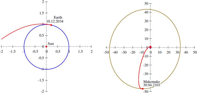 Characteristics of the transfers to Makemake are given in Table 3, where L is the launch , VA is the arrival velocity, T is the total , and TOF is the time of flight. Makemake is three astronomical units farther from the Sun than Haumea. This fact, associated with an inclination larger by one degree, makes the fuel consumption larger. It can be seen, from the total for the transfer trajectories to Makemake, that, for all the transfers, the fuel expenditures are slightly larger than the ones for the transfers to Haumea. Comparing Table 2 with Table 3, one can see that the same type of trajectory has larger values of the total for Makemake. As an example, for the transfer type A, which is a direct transfer to the body, the total is 8.24 km/s for the Earth-Haumea flight and 8.33 km/s for the Earth-Makemake flight. Transfer A1 for Makemake is shown in Figure 7.