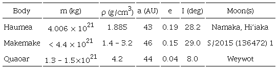 Makemake is the third largest TNO, after Pluto and Eris. It also has a recently discovered moon, which has no official name yet, and its general designation is “S/2015 (136472) 1” (Parker et al. 2016). Quaoar also has a small moon, named Weywot. This moon seems to be in an eccentric orbit. Like Haumea, Quaoar has a rocky core covered by a thin layer of ice, but differently from Haumea, Quaoar has a high density and probably its core is entirely formed by silicate material (Fraser et al. 2013). Then, Quaoar probably is the densest TNO, which makes it a good target for spacecraft exploration. Table 1 presents some orbital and physical characteristics of Haumea (Ragozzine & Brown 2009; Ortiz et al. 2017), Makemake (Brown 2013; Parker et al. 2016), and Quaoar (Fraser et al. 2013). The values of the semi-major axes (a), eccentricities (e) and inclinations (I) are approximate. The inclinations are given with respect to the ecliptic plane. Table 1 also presents the masses (m), densities (ρ), and the moons of these bodies.