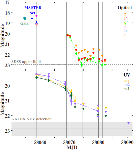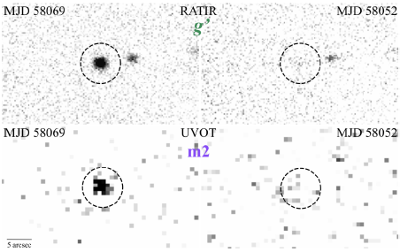 The optical and near-infrared follow-up was carried out by a ground-based campaign using the 1.5 m RATIR (Reionization and Transients InfraRed) telescope located at the Mexican Observatorio Astronómico Nacional (OAN) on the Sierra San Pedro Mártir (SPM) in Baja California (Watson et al. 2012). This campaign lasted from 2017 November 12 to 2017 November 25 and included 12 nights of observations with exposure times ranging from ≈0.8-2.4 hours per night (see Table 1 for a log of the RATIR observations). On each night, the source was observed using the SDSS g’, i’, and z’ bands. We analysed the RATIR data using the PYTHON package PhotoPipe4. This pipeline automatically reduced all the data, carrying out the following processing steps: (1) calibrating the images using the bias, dark, and flat fields, (2) performing astrometry, and (3) co-adding the data and performing absolute photometry. For both the RATIR as well as the UVOT results, all errors are given for the 1σ confidence level and all magnitudes correspond to the AB system. The light curve constructed using these data is shown in Figure 2.