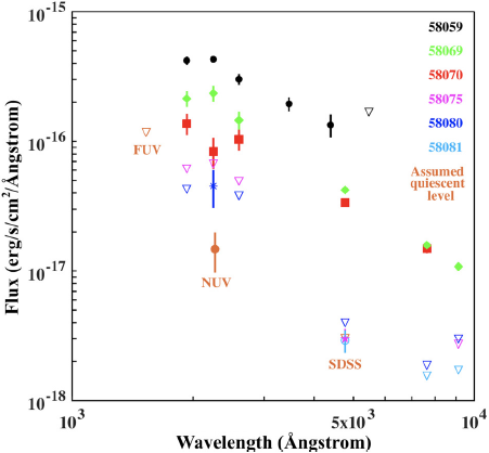 We also constructed an SED at the assumed pre-outburst quiescent level, using the GALEX and SDSS data, as is shown in orange in Figure 3. The spectral index obtained for our assumed pre-outburst quiescent level is . The upper limit determined using the GALEX/FUV band is unconstraining. We fit this pre-outburst quiescent level SED with a blackbody model which results in a blackbody temperature 12,000 K.