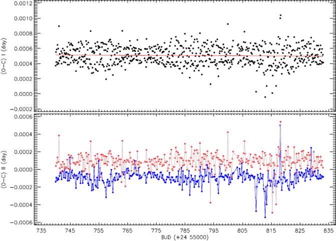 Using the epoch of 2455002.041 and the orbital period of 0.2623168 day given in the Kepler Eclipsing Binary Catalogue1 by Slawson et al. (2011), we computed the (O − C)I residuals. Then, using the Least-Squares method, we applied a linear correction to these residuals. The linear correction revealed that the (O − C)I residuals had a linear trend with a small slope; the distribution of the (O − C)I residuals seems to be linear, needing just a zero point correction. After the linear correction, we obtained the new ephemerides given in equation (1) and the (O − C)II residuals: