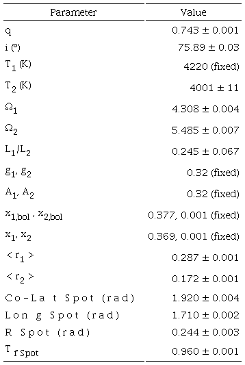 The PHOEBE V.0.32, needs a temperature value for the primary component. We determined its temperature from the J HK brightness given by Cutri et al. (2003). The de-reddened colors were found to be (H − K)o = 0m.252 and (J − K)o = 0m.629. Then a temperature value of 4220±20 K corresponding to the de-reddened colours was obtained by using the calibrations given by Tokunaga (2000). We accepted this value as the primary component temperature. The temperature of the secondary component was taken as an adjustable free parameter. In the analyses, some coefficients, such as the albedos (A1 and A2), the gravity-darkening coefficients (g1 and g2) and the limb-darkening coefficients (x1 and x2), were taken from the tables given by Lucy (1967); Rucinski (1969); Van Hamme (1993), considering the possible temperatures of both components. The rest of the parameters, such as the dimensionless potentials (Ω1 and Ω2), the fractional luminosity (L1) of the primary component, the inclination (i) and the mass ratio (q) of the system, were taken as adjustable free parameters.